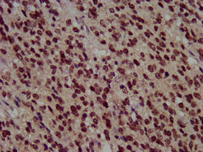 IHC image of CSB-PA010418OA36nacHU diluted at 1:100 and staining in paraffin-embedded human glioma performed on a Leica BondTM system. After dewaxing and hydration, antigen retrieval was mediated by high pressure in a citrate buffer (pH 6.0). Section was blocked with 10% normal goat serum 30min at RT. Then primary antibody (1% BSA) was incubated at 4°C overnight. The primary is detected by a biotinylated secondary antibody and visualized using an HRP conjugated SP system.