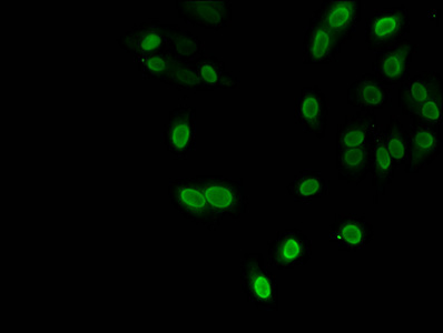 Immunofluorescent analysis of Hela cells using CSB-PA010418PA09nacHU at dilution of 1:100 and Alexa Fluor 488-congugated AffiniPure Goat Anti-Rabbit IgG(H+L)