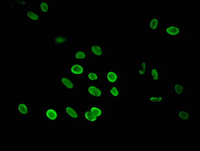 Immunofluorescent analysis of Hela cells using CSB-PA010418PA27nme1HU at dilution of 1:100 and Alexa Fluor 488-congugated AffiniPure Goat Anti-Rabbit IgG(H+L)