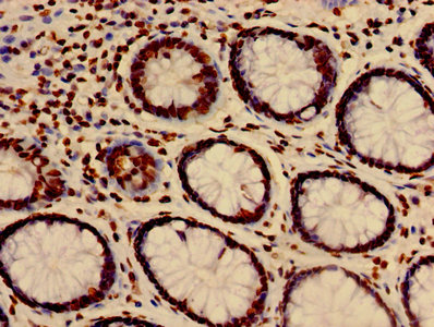 Immunohistochemistry of paraffin-embedded human colon cancer using CSB-PA010418PA27nme1HU at dilution of 1:100