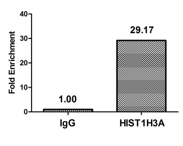 Chromatin Immunoprecipitation Hela (4*106) were treated with Micrococcal Nuclease, sonicated, and immunoprecipitated with 5µg anti-HIST1H3A (CSB-PA010418OA04nacHU) or a control normal rabbit IgG. The resulting ChIP DNA was quantified using real-time PCR with primers against the β-Globin promoter.