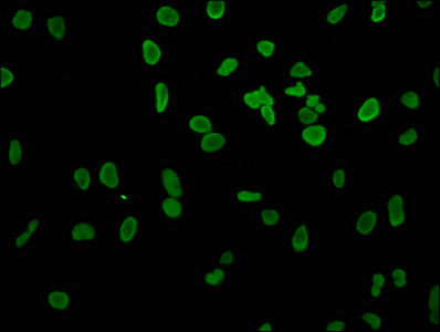 Immunofluorescence staining of Hela cells with CSB-PA010418OA04nacHU at 1:4, counter-stained with DAPI. The cells were fixed in 4% formaldehyde, permeabilized using 0.2% Triton X-100 and blocked in 10% normal Goat Serum. The cells were then incubated with the antibody overnight at 4°C. The secondary antibody was Alexa Fluor 488-congugated AffiniPure Goat Anti-Rabbit IgG(H+L).