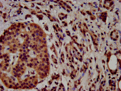 IHC image of CSB-PA010418OA04nacHU diluted at 1:100 and staining in paraffin-embedded human pancreatic cancer performed on a Leica BondTM system. After dewaxing and hydration, antigen retrieval was mediated by high pressure in a citrate buffer (pH 6.0). Section was blocked with 10% normal goat serum 30min at RT. Then primary antibody (1% BSA) was incubated at 4°C overnight. The primary is detected by a biotinylated secondary antibody and visualized using an HRP conjugated SP system.