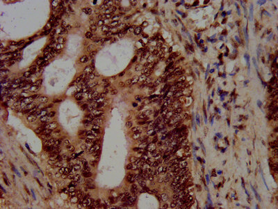 IHC image of CSB-PA010418OA04nacHU diluted at 1:100 and staining in paraffin-embedded human colon cancer performed on a Leica BondTM system. After dewaxing and hydration, antigen retrieval was mediated by high pressure in a citrate buffer (pH 6.0). Section was blocked with 10% normal goat serum 30min at RT. Then primary antibody (1% BSA) was incubated at 4°C overnight. The primary is detected by a biotinylated secondary antibody and visualized using an HRP conjugated SP system.