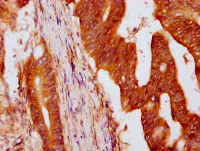 IHC image of CSB-PA010429OA08nhibHU diluted at 1:5 and staining in paraffin-embedded human colon cancer performed on a Leica BondTM system. After dewaxing and hydration, antigen retrieval was mediated by high pressure in a citrate buffer (pH 6.0). Section was blocked with 10% normal goat serum 30min at RT. Then primary antibody (1% BSA) was incubated at 4°C overnight. The primary is detected by a biotinylated secondary antibody and visualized using an HRP conjugated SP system.