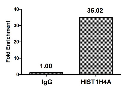 Chromatin Immunoprecipitation Hela (4*106) were treated with Micrococcal Nuclease, sonicated, and immunoprecipitated with 8µg anti-HIST1H4A (CSB-PA010429PA12nacHU) or a control normal rabbit IgG. The resulting ChIP DNA was quantified using real-time PCR with primers against the β-Globin promoter.