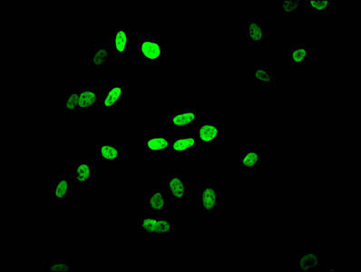 Immunofluorescent analysis of Hela cells using CSB-PA010429PA12nacHU at dilution of 1:100 and Alexa Fluor 488-congugated AffiniPure Goat Anti-Rabbit IgG(H+L)