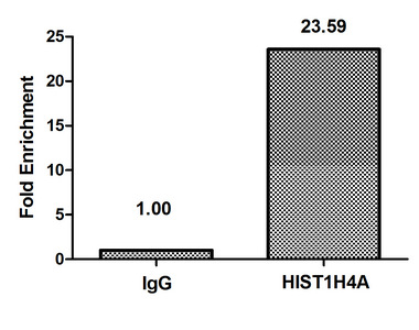 Chromatin Immunoprecipitation Hela (4*106) were treated with Micrococcal Nuclease, sonicated, and immunoprecipitated with 8µg anti-HIST1H4A (CSB-PA010429OA12nacHU) or a control normal rabbit IgG. The resulting ChIP DNA was quantified using real-time PCR with primers against the β-Globin promoter.
