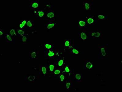 Immunofluorescent analysis of Hela cells using CSB-PA010429OA12nacHU at dilution of 1:100 and Alexa Fluor 488-congugated AffiniPure Goat Anti-Rabbit IgG(H+L)
