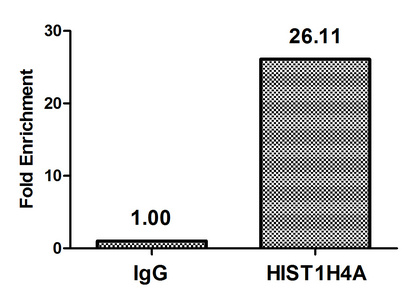 Chromatin Immunoprecipitation Hela (4*106) were treated with Micrococcal Nuclease, sonicated, and immunoprecipitated with 5µg anti-HIST1H4A (CSB-PA010429OA91nbutHU) or a control normal rabbit IgG. The resulting ChIP DNA was quantified using real-time PCR with primers against the β-Globin promoter.