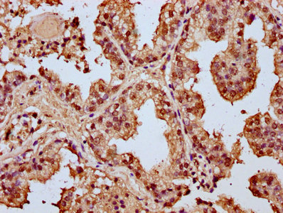 IHC image of CSB-PA010429OA91nbutHU diluted at 1:20 and staining in paraffin-embedded human prostate cancer performed on a Leica BondTM system. After dewaxing and hydration, antigen retrieval was mediated by high pressure in a citrate buffer (pH 6.0). Section was blocked with 10% normal goat serum 30min at RT. Then primary antibody (1% BSA) was incubated at 4°C overnight. The primary is detected by a biotinylated secondary antibody and visualized using an HRP conjugated SP system.