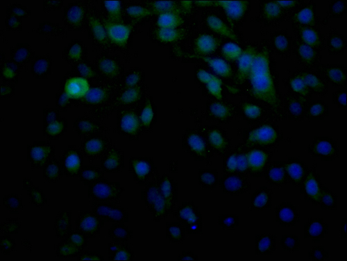 Immunofluorescence staining of HepG2 cells with CSB-PA361187LA01HU at 1:100, counter-stained with DAPI. The cells were fixed in 4% formaldehyde and blocked in 10% normal Goat Serum. The cells were then incubated with the antibody overnight at 4°C. The secondary antibody was Alexa Fluor 488-congugated AffiniPure Goat Anti-Rabbit IgG(H+L).