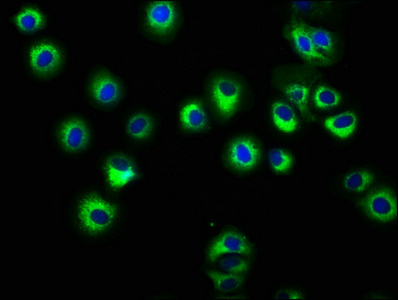 Immunofluorescence staining of HepG2 cells with CSB-PA320739LA01HU at 1:166, counter-stained with DAPI. The cells were fixed in 4% formaldehyde, permeabilized using 0.2% Triton X-100 and blocked in 10% normal Goat Serum. The cells were then incubated with the antibody overnight at 4°C. The secondary antibody was Alexa Fluor 488-congugated AffiniPure Goat Anti-Rabbit IgG(H+L).