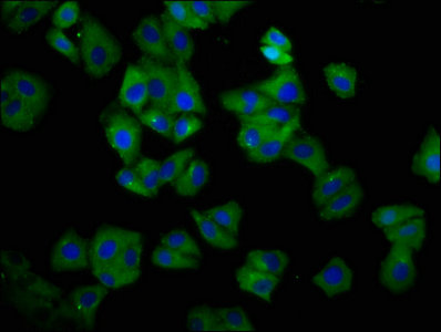 Immunofluorescence staining of HepG2 cells with CSB-PA356221LA01HU at 1:66, counter-stained with DAPI. The cells were fixed in 4% formaldehyde, permeabilized using 0.2% Triton X-100 and blocked in 10% normal Goat Serum. The cells were then incubated with the antibody overnight at 4°C. The secondary antibody was Alexa Fluor 488-congugated AffiniPure Goat Anti-Rabbit IgG(H+L).