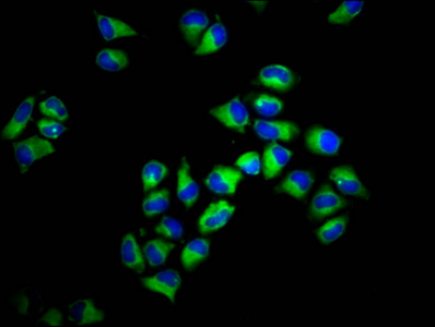 Immunofluorescence staining of Hela cells with CSB-PA335552LA01HU at 1:133, counter-stained with DAPI. The cells were fixed in 4% formaldehyde, permeabilized using 0.2% Triton X-100 and blocked in 10% normal Goat Serum. The cells were then incubated with the antibody overnight at 4°C. The secondary antibody was Alexa Fluor 488-congugated AffiniPure Goat Anti-Rabbit IgG(H+L).