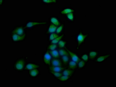 Immunofluorescence staining of Hela cells with CSB-PA010584HA01HU at 1:100, counter-stained with DAPI. The cells were fixed in 4% formaldehyde, permeabilized using 0.2% Triton X-100 and blocked in 10% normal Goat Serum. The cells were then incubated with the antibody overnight at 4°C. The secondary antibody was Alexa Fluor 488-congugated AffiniPure Goat Anti-Rabbit IgG(H+L).