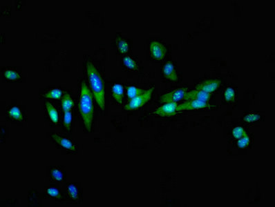 Immunofluorescent analysis of Hela cells using CSB-PA010791LA01HU at dilution of 1:100 and Alexa Fluor 488-congugated AffiniPure Goat Anti-Rabbit IgG(H+L)