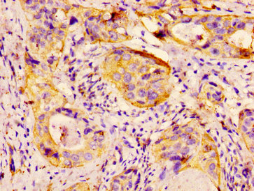 IHC image of CSB-PA10869A0Rb diluted at 1:300 and staining in paraffin-embedded human cervical cancer performed on a Leica BondTM system. After dewaxing and hydration, antigen retrieval was mediated by high pressure in a citrate buffer (pH 6.0). Section was blocked with 10% normal goat serum 30min at RT. Then primary antibody (1% BSA) was incubated at 4°C overnight. The primary is detected by a biotinylated secondary antibody and visualized using an HRP conjugated SP system.