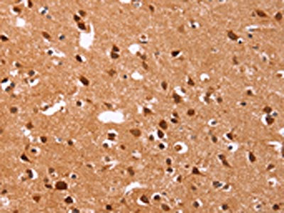 The image on the left is immunohistochemistry of paraffin-embedded Human brain tissue using CSB-PA216671(ICAM3 Antibody) at dilution 1/20, on the right is treated with synthetic peptide. (Original magnification: ×200)