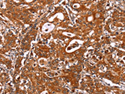 The image on the left is immunohistochemistry of paraffin-embedded Human gastic cancer tissue using CSB-PA216671(ICAM3 Antibody) at dilution 1/20, on the right is treated with synthetic peptide. (Original magnification: ×200)