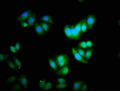 Immunofluorescence staining of HepG2 cells with CSB-PA010967LA01HU at 1:333, counter-stained with DAPI. The cells were fixed in 4% formaldehyde, permeabilized using 0.2% Triton X-100 and blocked in 10% normal Goat Serum. The cells were then incubated with the antibody overnight at 4°C. The secondary antibody was Alexa Fluor 488-congugated AffiniPure Goat Anti-Rabbit IgG(H+L).