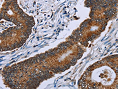 The image on the left is immunohistochemistry of paraffin-embedded Human colon cancer tissue using CSB-PA586287(IDH2 Antibody) at dilution 1/60, on the right is treated with fusion protein. (Original magnification: ×200)