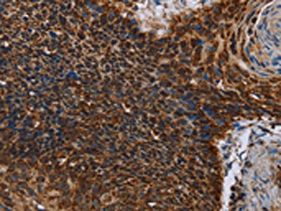 The image on the left is immunohistochemistry of paraffin-embedded Human cervical cancer tissue using CSB-PA586287(IDH2 Antibody) at dilution 1/60, on the right is treated with fusion protein. (Original magnification: ×200)