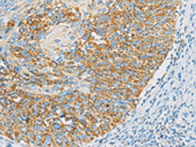 The image on the left is immunohistochemistry of paraffin-embedded Human cervical cancer tissue using CSB-PA066473(IDH3G Antibody) at dilution 1/30, on the right is treated with fusion protein. (Original magnification: ×200)