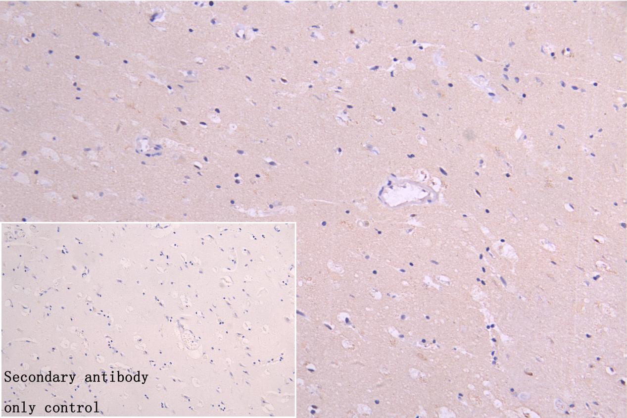 IHC image of CSB-PA06504A0Rb diluted at 1:200 and staining in paraffin-embedded human brain tissue performed on a Leica BondTM system. After dewaxing and hydration, antigen retrieval was mediated by high pressure in a citrate buffer (pH 6.0). Section was blocked with 10% normal goat serum 30min at RT. Then primary antibody (1% BSA) was incubated at 4°C overnight. The primary is detected by a Goat anti-rabbit polymer IgG labeled by HRP and visualized using 0.05% DAB.