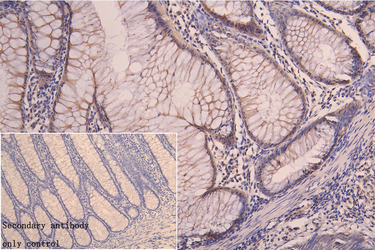 IHC image of CSB-PA06504A0Rb diluted at 1:200 and staining in paraffin-embedded human colorectal cancer performed on a Leica BondTM system. After dewaxing and hydration, antigen retrieval was mediated by high pressure in a citrate buffer (pH 6.0). Section was blocked with 10% normal goat serum 30min at RT. Then primary antibody (1% BSA) was incubated at 4°C overnight. The primary is detected by a Goat anti-rabbit polymer IgG labeled by HRP and visualized using 0.05% DAB.