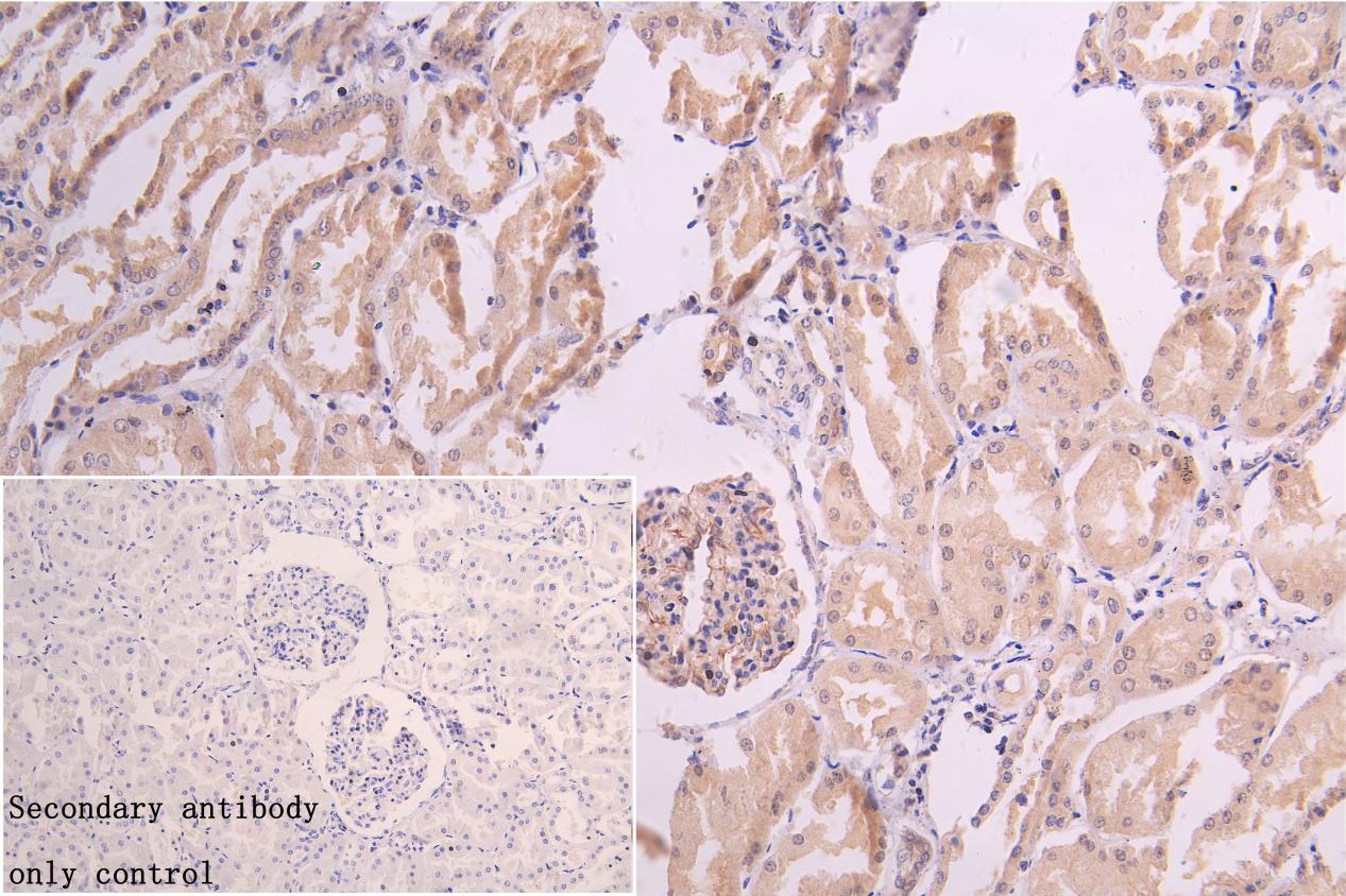 IHC image of CSB-PA06504A0Rb diluted at 1:200 and staining in paraffin-embedded human kidney tissue performed on a Leica BondTM system. After dewaxing and hydration, antigen retrieval was mediated by high pressure in a citrate buffer (pH 6.0). Section was blocked with 10% normal goat serum 30min at RT. Then primary antibody (1% BSA) was incubated at 4°C overnight. The primary is detected by a Goat anti-rabbit polymer IgG labeled by HRP and visualized using 0.05% DAB.