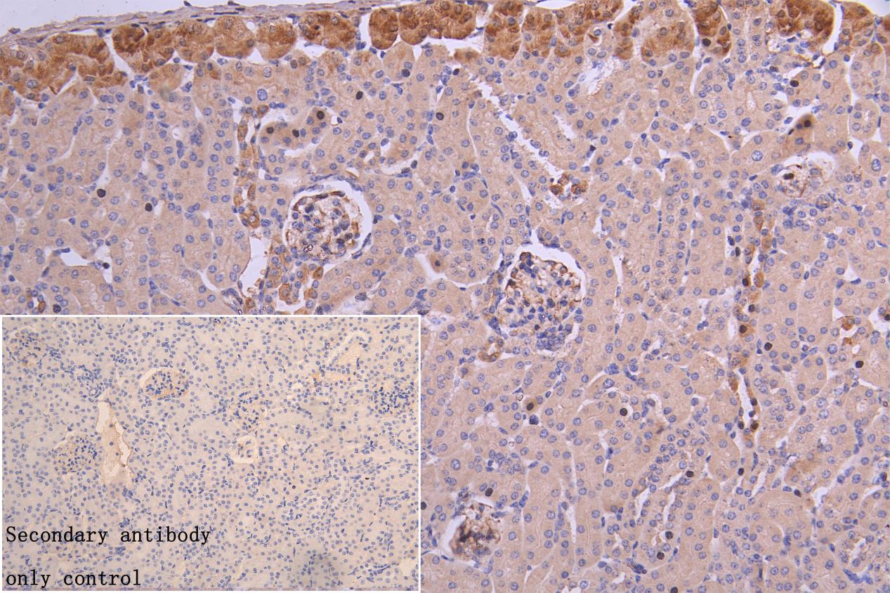 IHC image of CSB-PA06504A0Rb diluted at 1:200 and staining in paraffin-embedded Mouse kidney tissue performed on a Leica BondTM system. After dewaxing and hydration, antigen retrieval was mediated by high pressure in a citrate buffer (pH 6.0). Section was blocked with 10% normal goat serum 30min at RT. Then primary antibody (1% BSA) was incubated at 4°C overnight. The primary is detected by a Goat anti-rabbit polymer IgG labeled by HRP and visualized using 0.05% DAB.