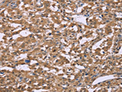 The image on the left is immunohistochemistry of paraffin-embedded Human liver cancer tissue using CSB-PA048892(IFNA2 Antibody) at dilution 1/40, on the right is treated with synthetic peptide. (Original magnification: ×200)