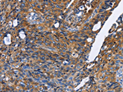 The image on the left is immunohistochemistry of paraffin-embedded Human cervical cancer tissue using CSB-PA995781(IFNG Antibody) at dilution 1/30, on the right is treated with fusion protein. (Original magnification: ×200)