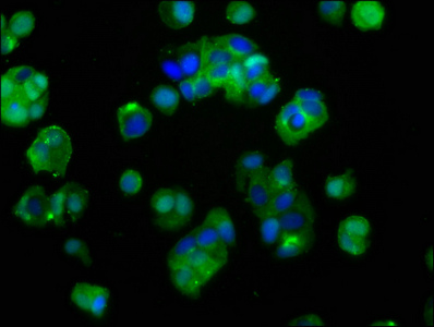 Immunofluorescence staining of MCF-7 cells with CSB-PA08395A0Rb at 1:400, counter-stained with DAPI. The cells were fixed in 4% formaldehyde, permeabilized using 0.2% Triton X-100 and blocked in 10% normal Goat Serum. The cells were then incubated with the antibody overnight at 4°C. The secondary antibody was Alexa Fluor 488-congugated AffiniPure Goat Anti-Rabbit IgG(H+L).