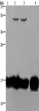 Gel: 10%SDS-PAGE, Lysate: 40 μg, Lane 1-4: A549 cells, K562 cells, Raji cells, human fetal intestine tissue, Primary antibody: CSB-PA809269(IL17C Antibody) at dilution 1/250, Secondary antibody: Goat anti rabbit IgG at 1/8000 dilution, Exposure time: 20 seconds