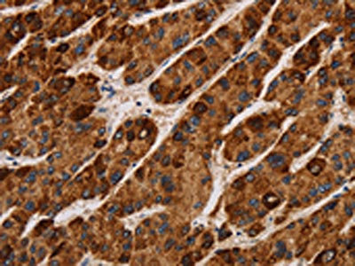 The image on the left is immunohistochemistry of paraffin-embedded Human liver cancer tissue using CSB-PA703502(IL17RA Antibody) at dilution 1/40, on the right is treated with synthetic peptide. (Original magnification: ×200)