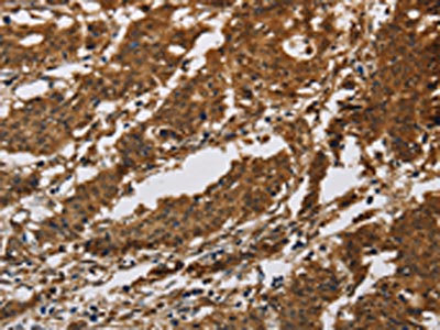 The image on the left is immunohistochemistry of paraffin-embedded Human gastric cancer tissue using CSB-PA891383(IL17RB Antibody) at dilution 1/40, on the right is treated with synthetic peptide. (Original magnification: ×200)