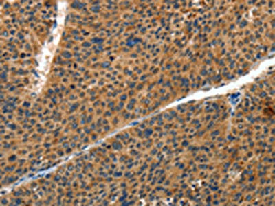The image on the left is immunohistochemistry of paraffin-embedded Human liver cancer tissue using CSB-PA903370(IL22RA1 Antibody) at dilution 1/20, on the right is treated with fusion protein. (Original magnification: ×200)