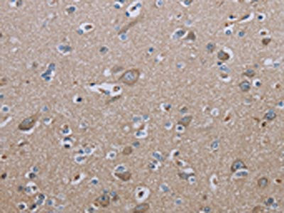 The image on the left is immunohistochemistry of paraffin-embedded Human brain tissue using CSB-PA298467(IL27RA Antibody) at dilution 1/40, on the right is treated with fusion protein. (Original magnification: ×200)
