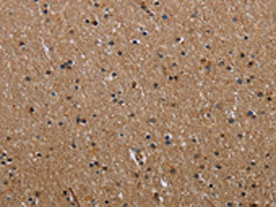 The image on the left is immunohistochemistry of paraffin-embedded Human brain tissue using CSB-PA927147(IL2RG Antibody) at dilution 1/20, on the right is treated with fusion protein. (Original magnification: ×200)