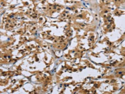 The image on the left is immunohistochemistry of paraffin-embedded Human thyroid cancer tissue using CSB-PA239746(IL31 Antibody) at dilution 1/20, on the right is treated with synthetic peptide. (Original magnification: ×200)