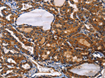 The image on the left is immunohistochemistry of paraffin-embedded Human thyroid cancer tissue using CSB-PA087041(ILK Antibody) at dilution 1/50, on the right is treated with fusion protein. (Original magnification: ×200)