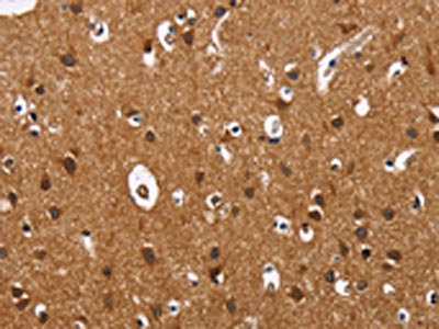 The image on the left is immunohistochemistry of paraffin-embedded Human brain tissue using CSB-PA941698(ILK Antibody) at dilution 1/60, on the right is treated with fusion protein. (Original magnification: ×200)