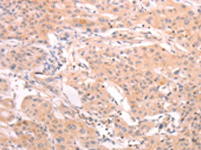 The image on the left is immunohistochemistry of paraffin-embedded Human gastic cancer tissue using CSB-PA102299(INA Antibody) at dilution 1/25, on the right is treated with synthetic peptide. (Original magnification: ×200)