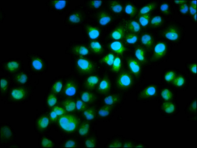 Immunofluorescence staining of Hela cells with CSB-PA891544LA01HU at 1:100, counter-stained with DAPI. The cells were fixed in 4% formaldehyde, permeabilized using 0.2% Triton X-100 and blocked in 10% normal Goat Serum. The cells were then incubated with the antibody overnight at 4°C. The secondary antibody was Alexa Fluor 488-congugated AffiniPure Goat Anti-Rabbit IgG(H+L).