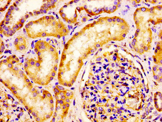 IHC image of CSB-PA621862LA01HU diluted at 1:100 and staining in paraffin-embedded human kidney tissue performed on a Leica BondTM system. After dewaxing and hydration, antigen retrieval was mediated by high pressure in a citrate buffer (pH 6.0). Section was blocked with 10% normal goat serum 30min at RT. Then primary antibody (1% BSA) was incubated at 4°C overnight. The primary is detected by a biotinylated secondary antibody and visualized using an HRP conjugated SP system.