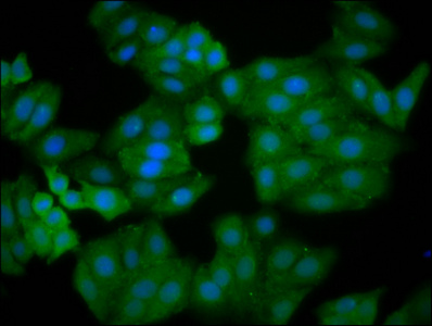 Immunofluorescence staining of HepG2 cells with CSB-PA615701LA01HU at 1:166, counter-stained with DAPI. The cells were fixed in 4% formaldehyde, permeabilized using 0.2% Triton X-100 and blocked in 10% normal Goat Serum. The cells were then incubated with the antibody overnight at 4°C. The secondary antibody was Alexa Fluor 488-congugated AffiniPure Goat Anti-Rabbit IgG(H+L).
