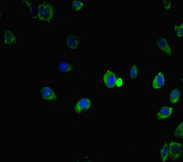 Immunofluorescent analysis of Hela cells using CSB-PA011820LA01HU at dilution of 1:100 and Alexa Fluor 488-congugated AffiniPure Goat Anti-Rabbit IgG(H+L)
