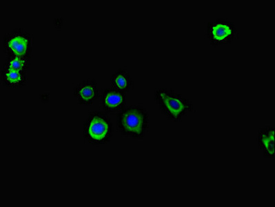 Immunofluorescent analysis of HepG2 cells using CSB-PA011867LA01HU at dilution of 1:100 and Alexa Fluor 488-congugated AffiniPure Goat Anti-Rabbit IgG(H+L)